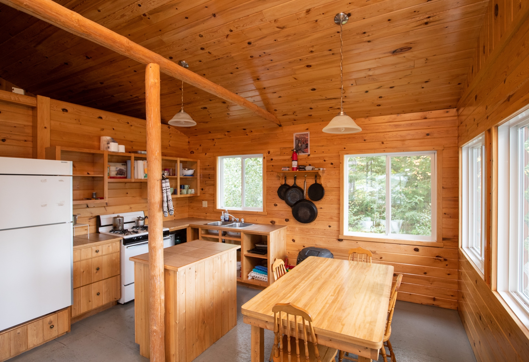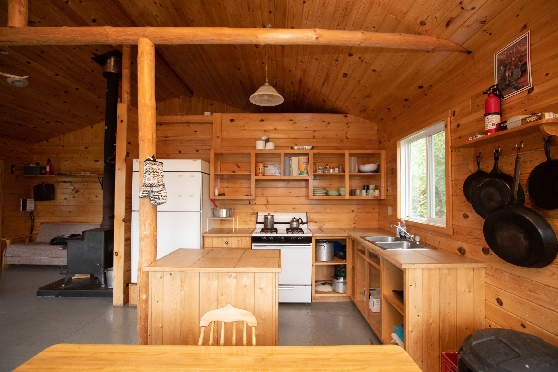 Ajax Cabin interior view. Fridge, Stove, hot water and solar lights